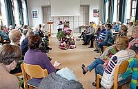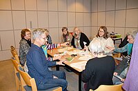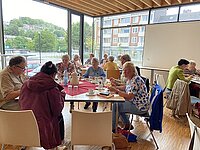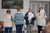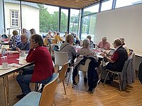 Im geschmackvollen Ambiente des Wintergartens gab es neben dem kulinarischen Genuss und Austausch eine regionale thematische Einlage: Claudia Montanus vom Landesverband Ev. Frauenhilfe in Westfalen e.V. referierte kurzweilig über das Buch „Nach Hause gehen. Eine Heimatsuche“ des Journalisten Jörn Klare, das vor einigen Jahren den Ev. Buchpreis gewann. Er wanderte von Berlin zu seinem Geburtsort Hagen-Hohenlimburg – für die Frauen „um die Ecke“. Die interaktiv gestaltete Lesung von passenden Passagen brachte die Frauen mit dem Thema „Heimat“ in Kontakt. Bewegend, zum Schmunzeln, nachdenklich.