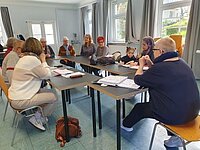 Bei der Diakonie können die Zuflucht suchenden niederschwellige Deutschkurse besuchen, die noch leom Anrecht auf einen vom BAMF (Bundesamt für Migration und Flucht) geförderten Sprachkurs haben. Dieses Angebot wird finanziell weder vom Bund noch Landbezuschusst bzw. gefördert.