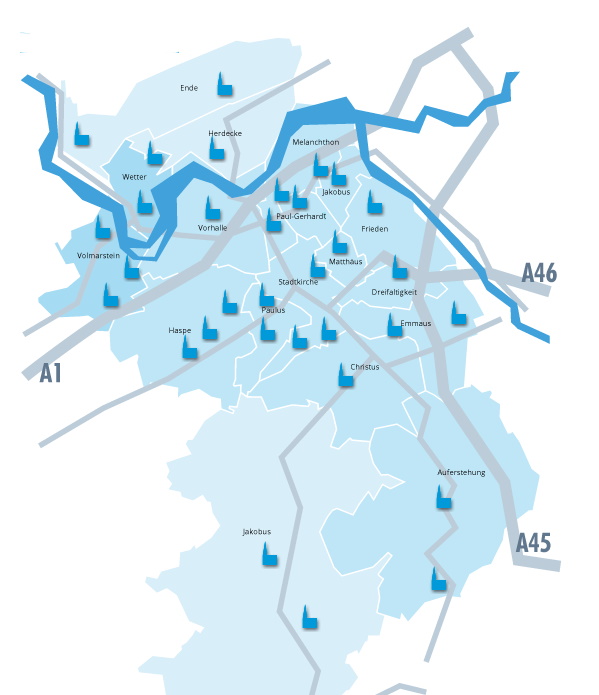 Durch Anklicken gelangen Sie zur interaktiven Gemeindekarte des Kirchenkreises Hagen. Quelle: Kirchenkreis Hagen